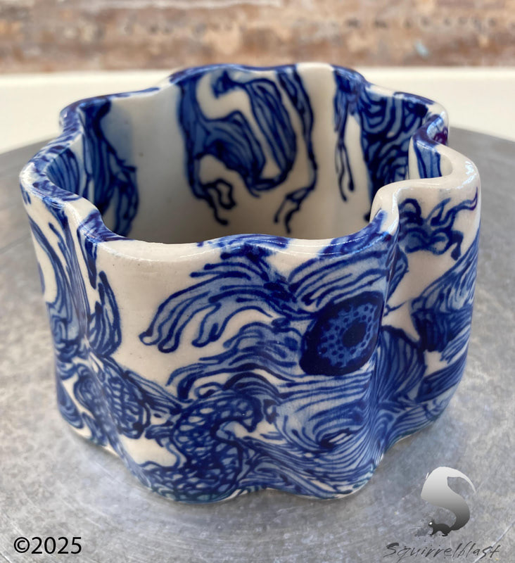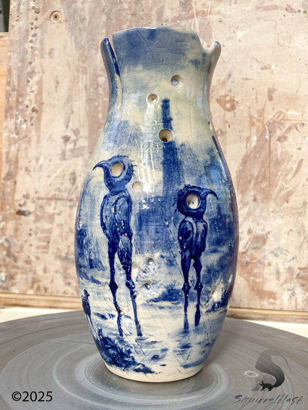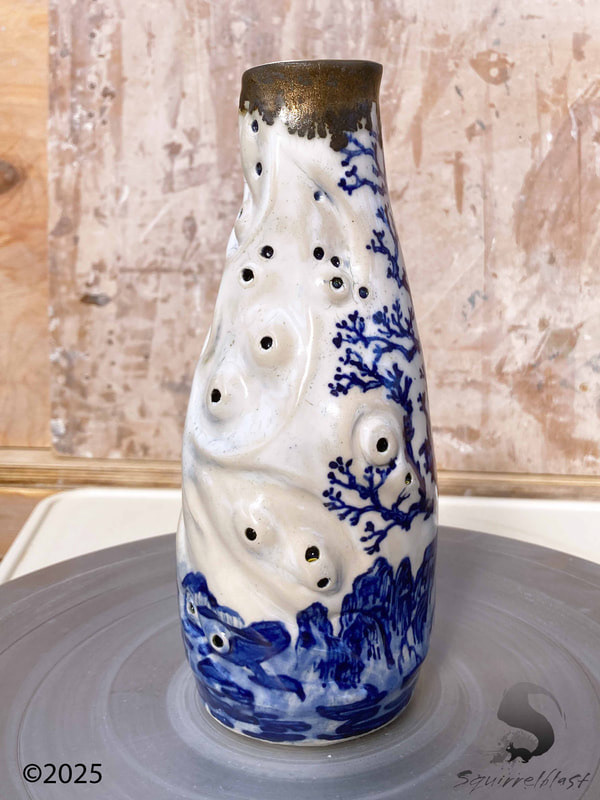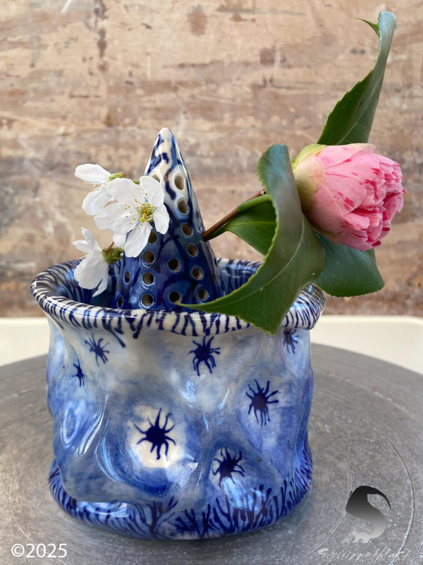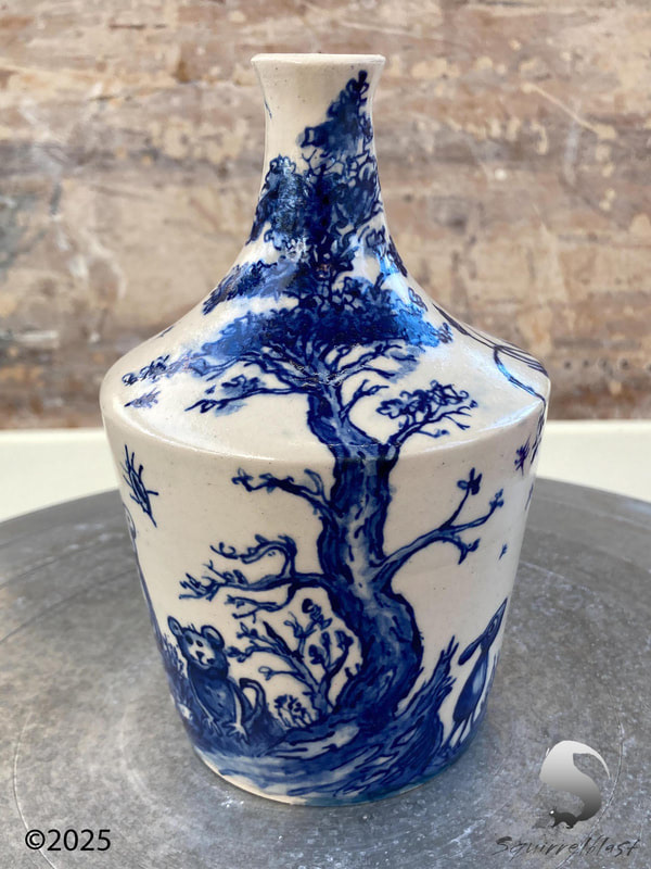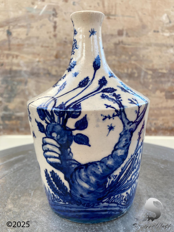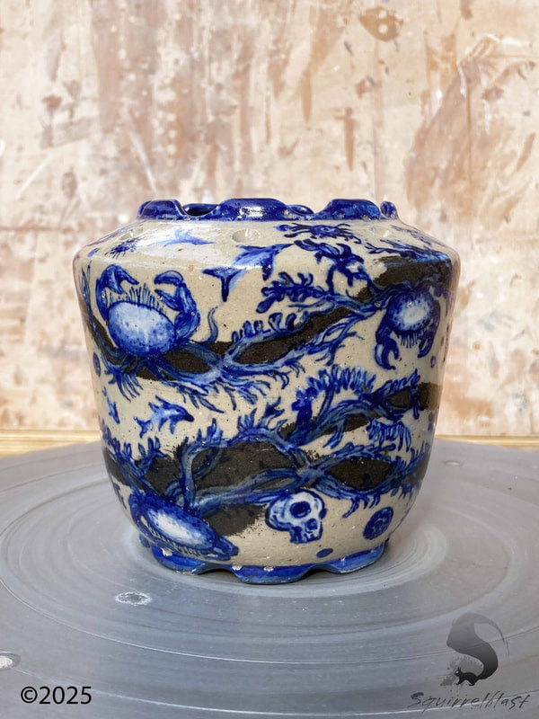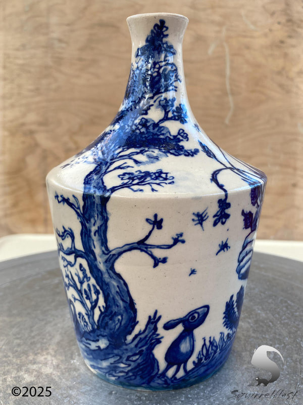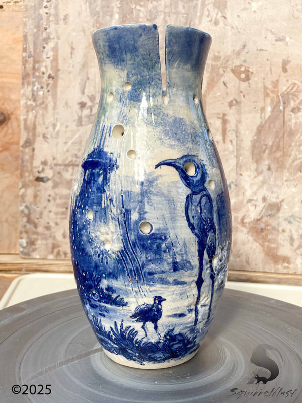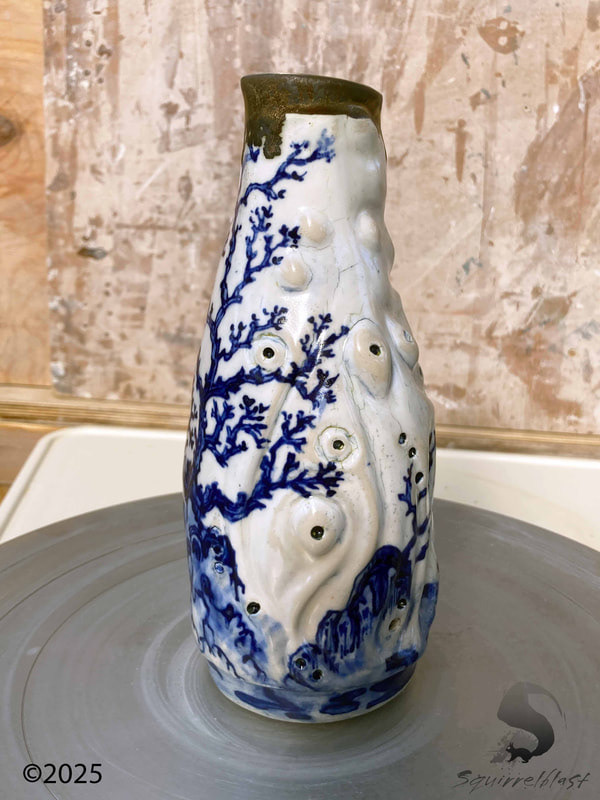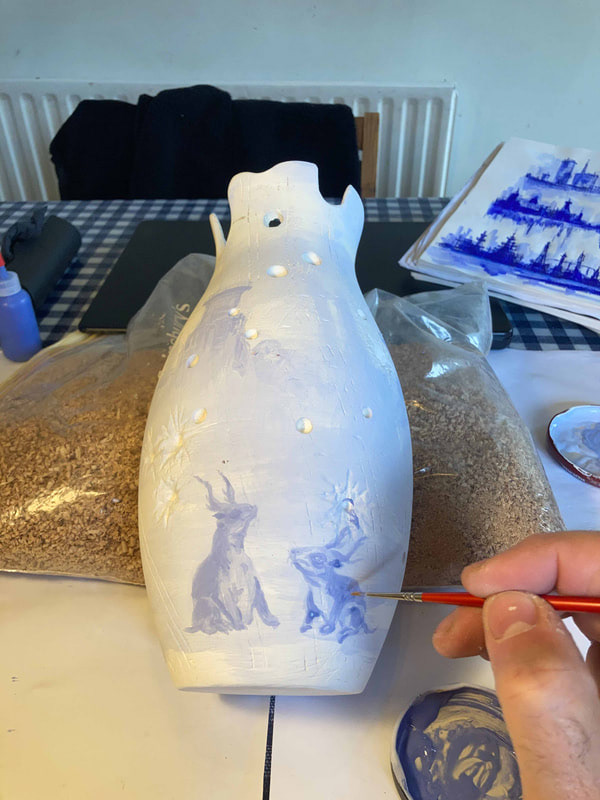 When the clay is 'leather hard' trimming and adding details on the greenware is a long and time consuming activity. Brushing underglazes on bisque fired pots is another tricky one. Applied colours are instantaneously sucked into the fired clay. The technique is completely different from painting on canvas or paper. Brush marks are pretty short , contrast has to be imagined as the darkest tones are very pale before the 'glaze firing' stage. Liquid glaze colours do not match the final fired glazes, therefore there is no margin for error.