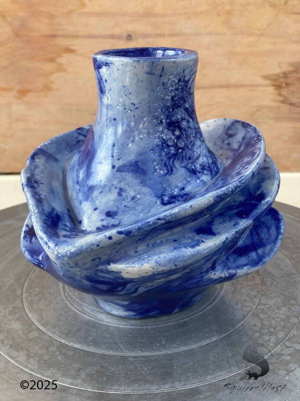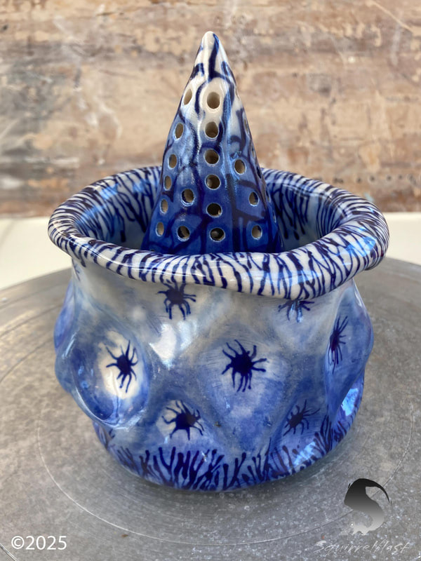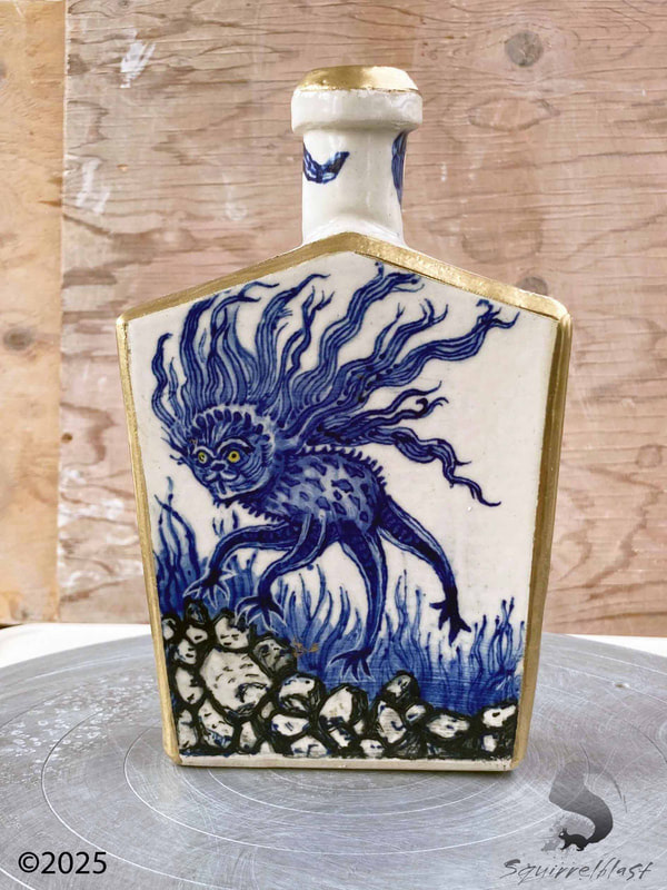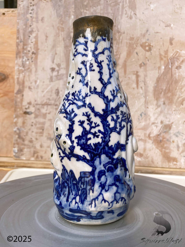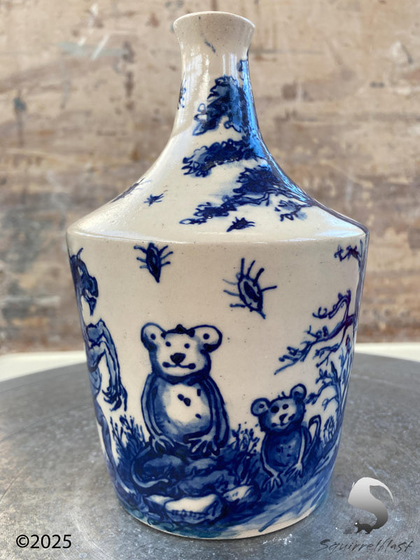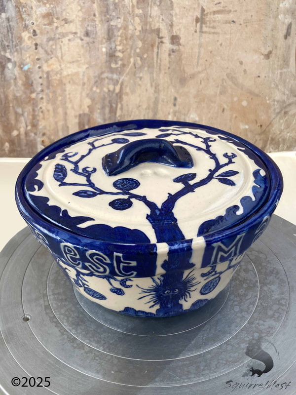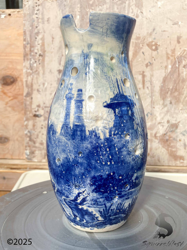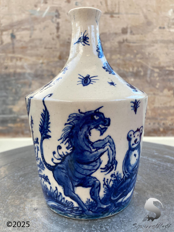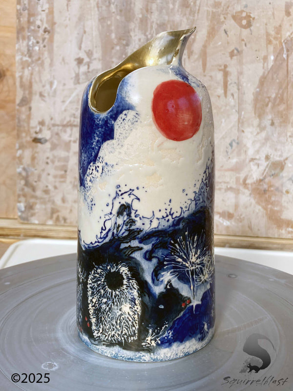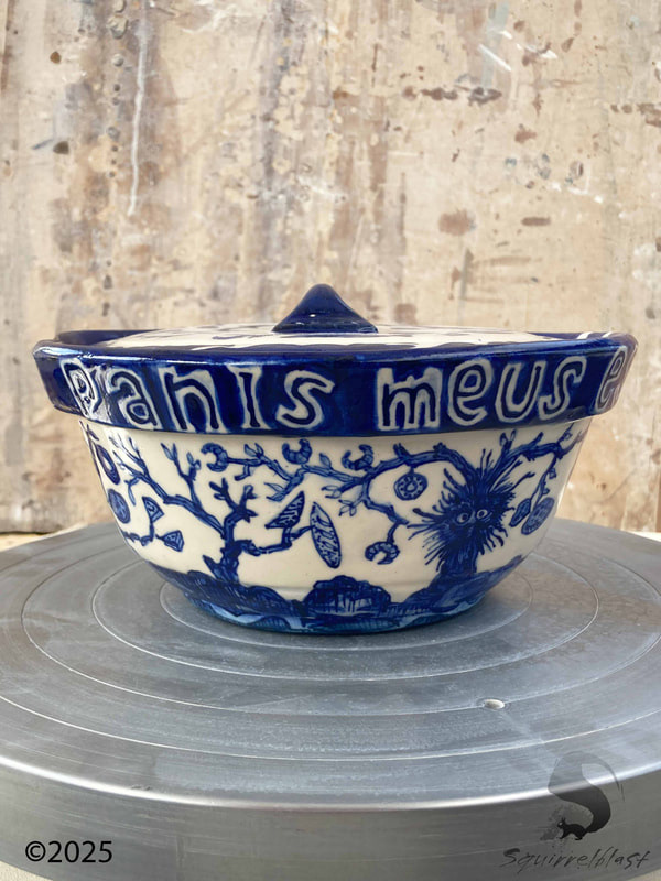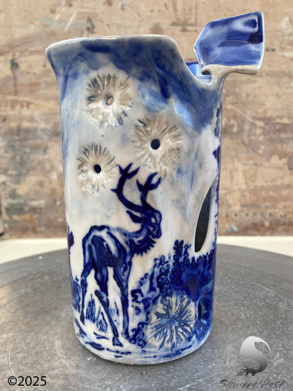 When the clay is 'leather hard' trimming and adding details on the greenware is a long and time consuming activity. Brushing underglazes on bisque fired pots is another tricky one. Applied colours are instantaneously sucked into the fired clay. The technique is completely different from painting on canvas or paper. Brush marks are pretty short , contrast has to be imagined as the darkest tones are very pale before the 'glaze firing' stage. Liquid glaze colours do not match the final fired glazes, therefore there is no margin for error.