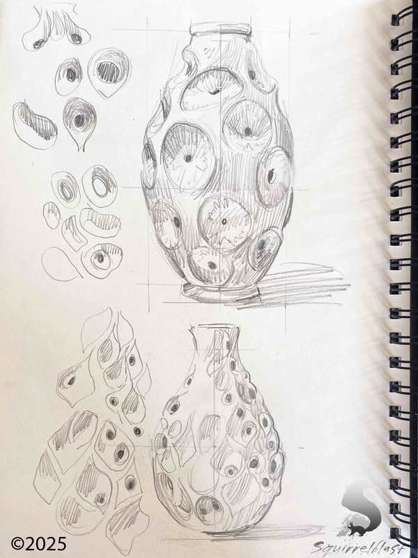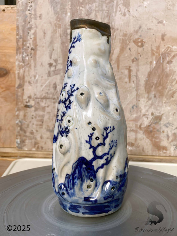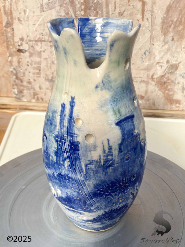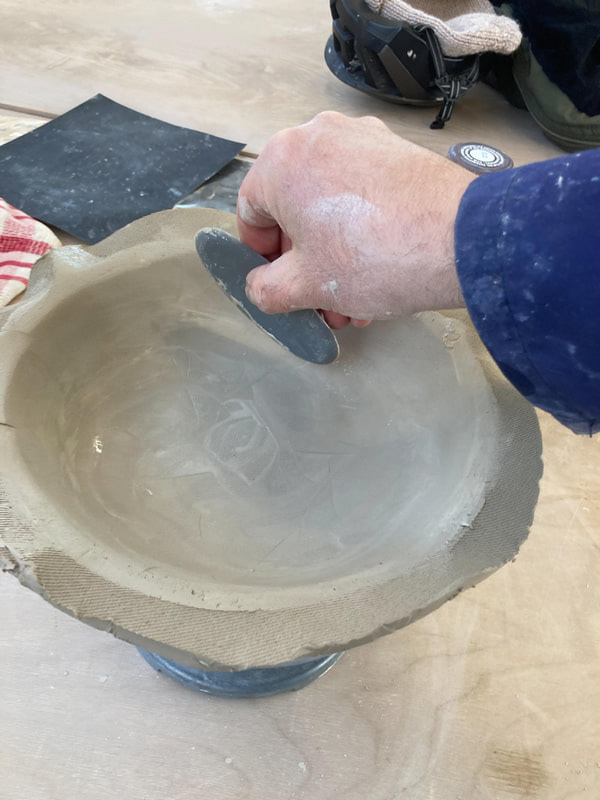 I built this pot from slabs. I got some cracks therefore it ended up with a lot of holes and cuts.