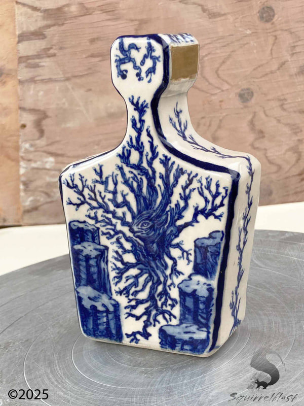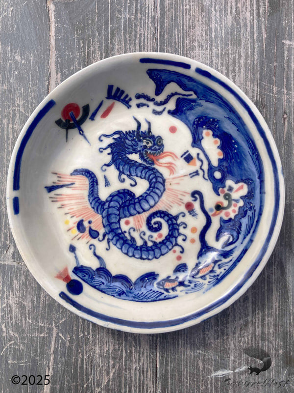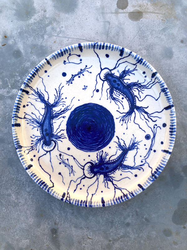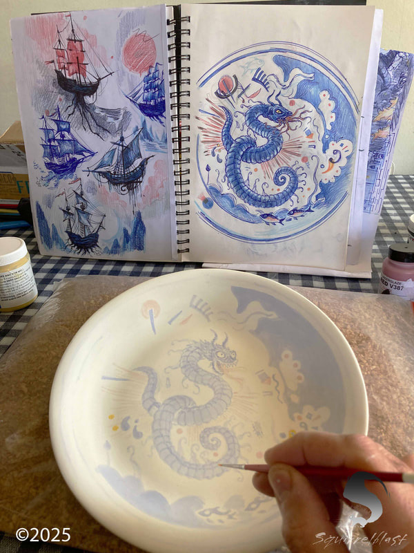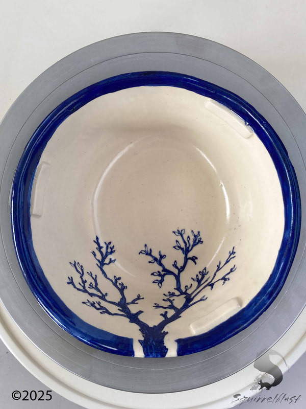 I decorated a plate that she left in our shed two years ago. It was my first painting with blue underglaze.